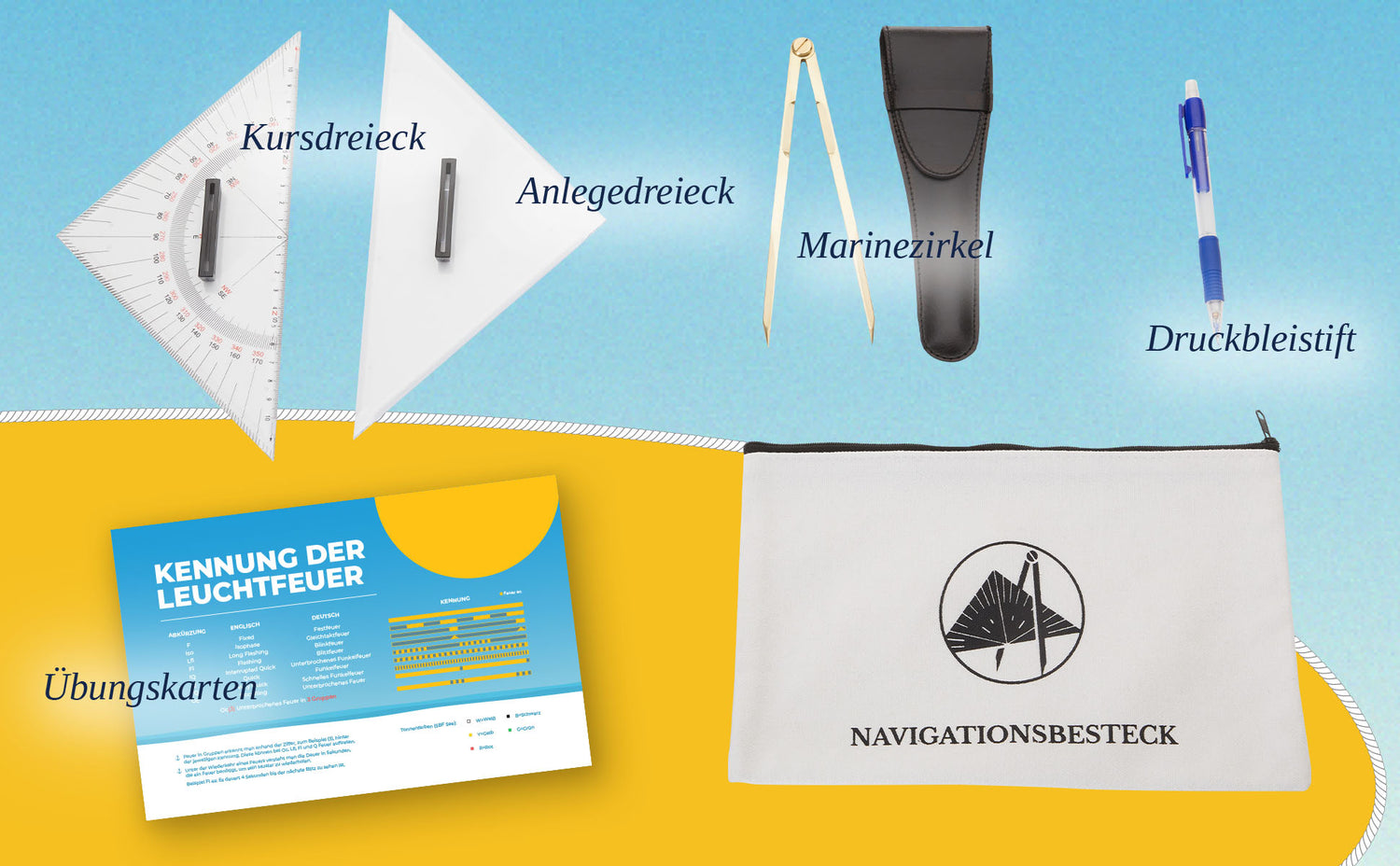 Dieses Set enthält alles für die manuelle Navigation: Kurs- und Anlegedreieck, Marinezirkel, Druckbleistift und Übungskarte. In der praktischen Tasche verstaut bist du bereit für den Sportbootführerschein!