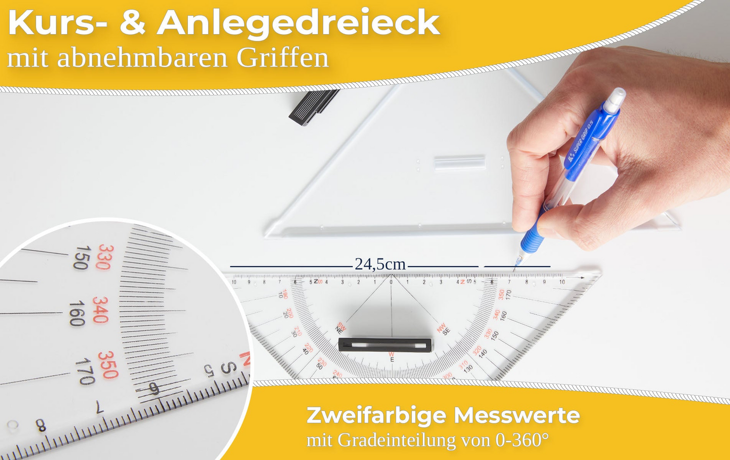📐 NAVIGATIONSDREIECK - Kursdreieck und Anlegedreieck weisen eine ideale Hypotenuesenlänge von 24,5cm auf. Die Haltgriffe können dank Clipverschluss, leicht angebracht und entfernt werden