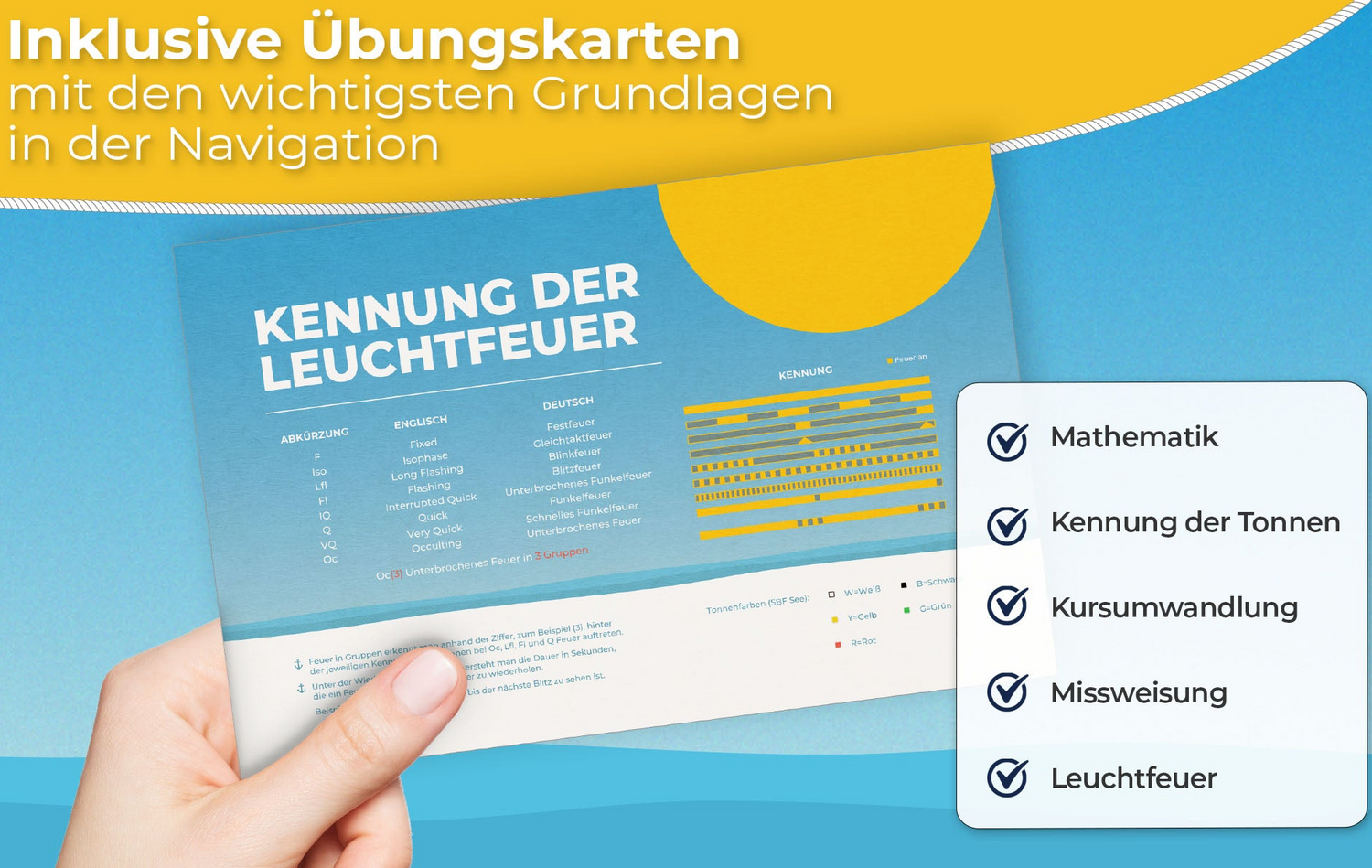 🎓 EFFIZENTES LERNEN - Der beigelegte Hilfsflyer unterstützt Sie bei den wichtigsten Bestandteilen der nautische Navigation: Der Mathematik, Kennung der Tonnen und der Berechnung von Kursen